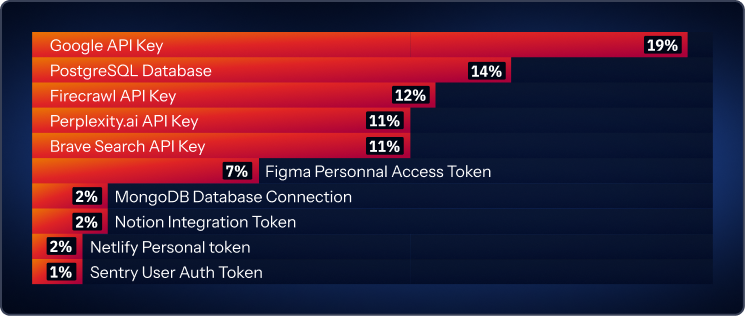 One of the strongest additions in this year’s report is the section on Model Context Protocol (MCP). MCP emerged in early 2025 as a common way to connect large language models to external tools and data sources. GitGuardian research found 24,008 unique secrets exposed in MCP configuration files. 14% of those were PostgreSQL database connection strings. The top leaked secret types in those files were Google API keys at 19.2%, PostgreSQL connection strings at 14%, Firecrawl at 11.9%, Perplexity at 11.2%, and Brave Search at 11%.
