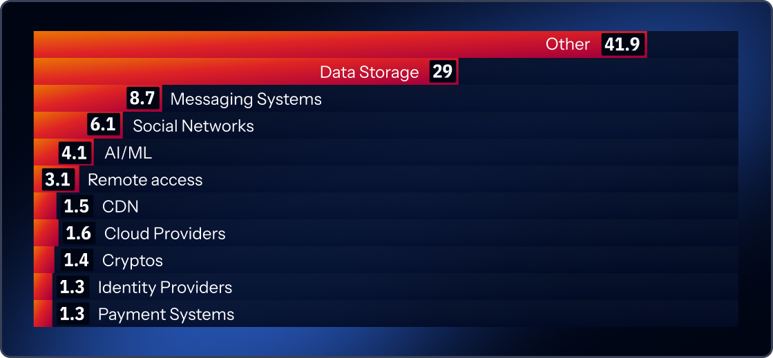 For AI media and voice infrastructure, we see the largest changes from Vapi, up 780%. This is a developer platform for voice-based AI agents using real-time audio. Seeing these keys leak suggests that AI is moving into customer-facing experiences like voice support, sales calls, and content production, introducing new vendors and new secrets into everyday repos.