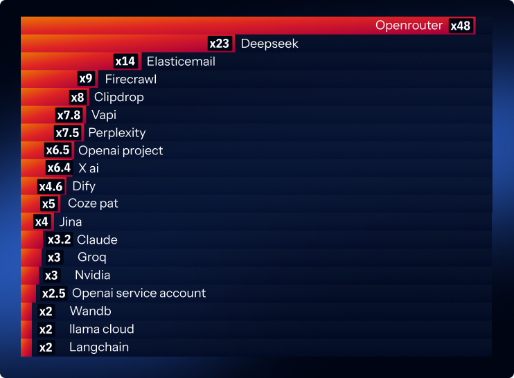 The best example of this trend is OpenRouter, which saw an astounding 4,661% more leaks. Their platform usually does not operate a single proprietary model. Instead, they act more like a gateway that lets developers access and switch among multiple models through one API.