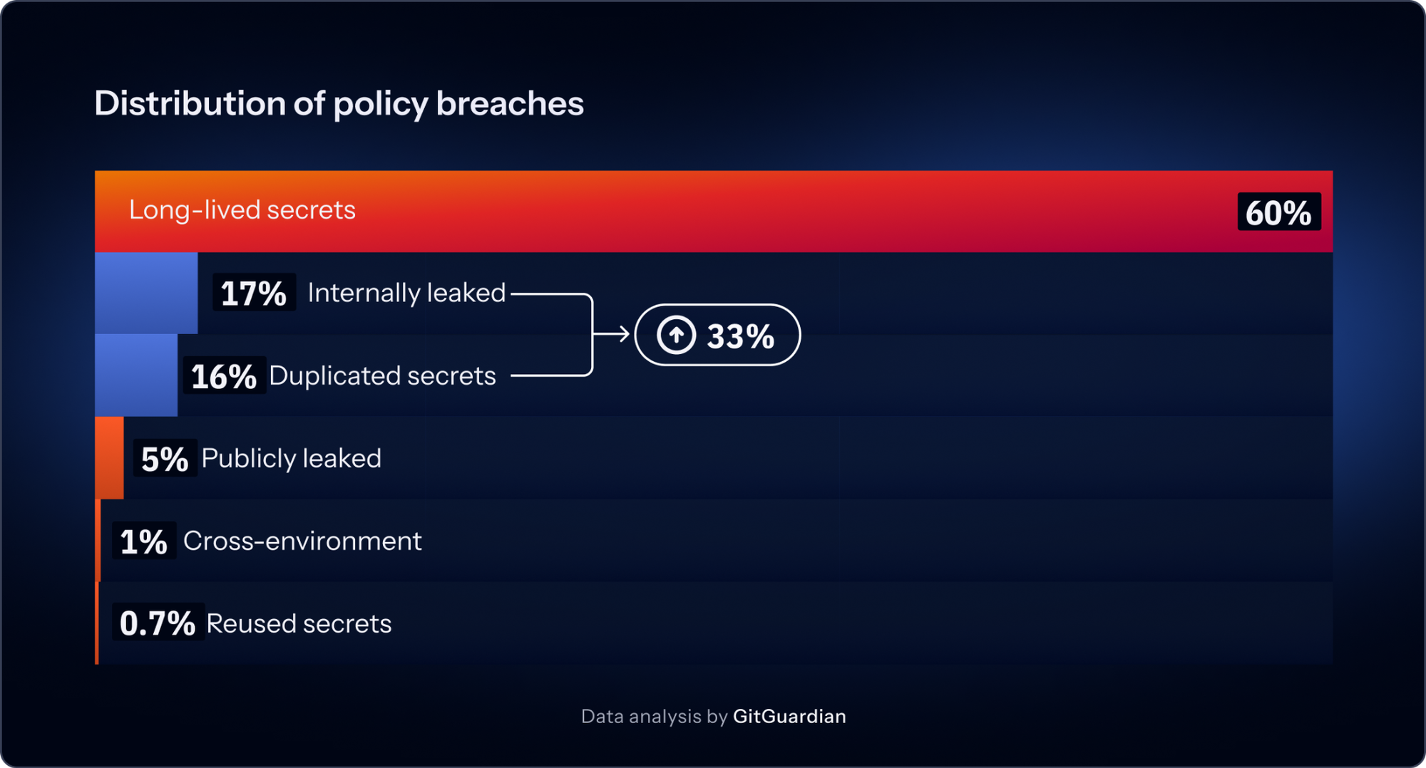 GitGuardian’s policy-breach distribution makes that plain. Long-lived secrets account for 60% of policy breaches. Internally leaked secrets make up 17%. Duplicated secrets account for 16%. Publicly leaked secrets are 5%. Cross-environment leaks are 1%, and reused secrets are 0.7%. That is a useful breakdown because it shows the dominant problem is lifecycle negligence. Secrets live too long, spread too widely, and get copied faster than they are governed.