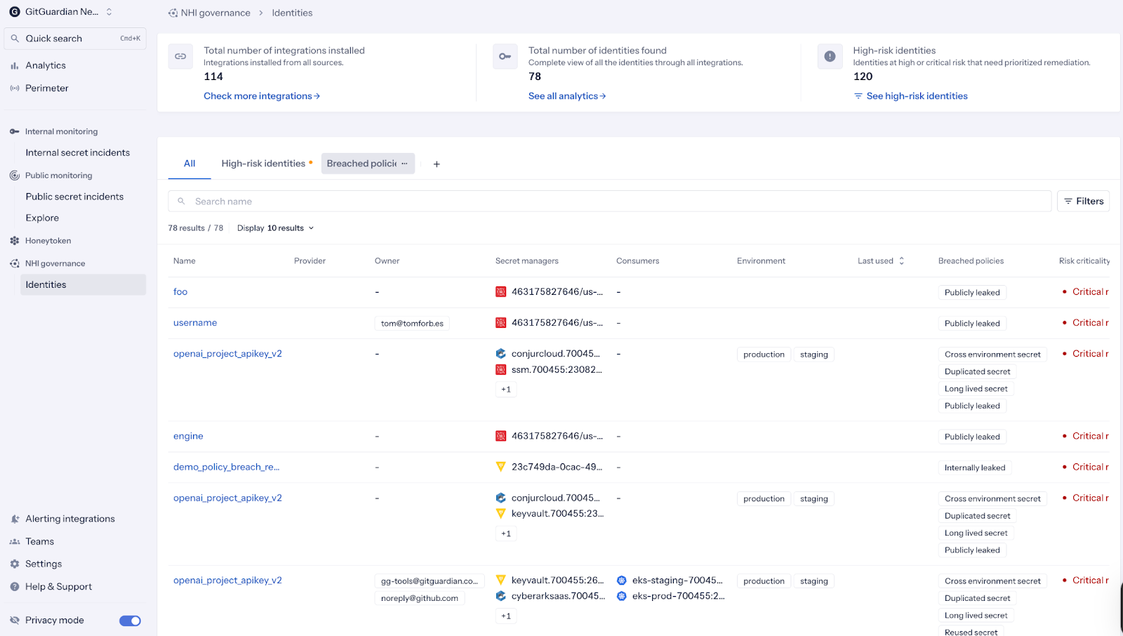 GitGuardian NHI Governance platform adds contextual enrichment by associating secrets with repositories, services, environments, and identity types. This context clarifies reachability and privilege concentration, allowing governance stakeholders to understand not just that a secret exists, but what systems it enables and why it matters from a risk perspective.