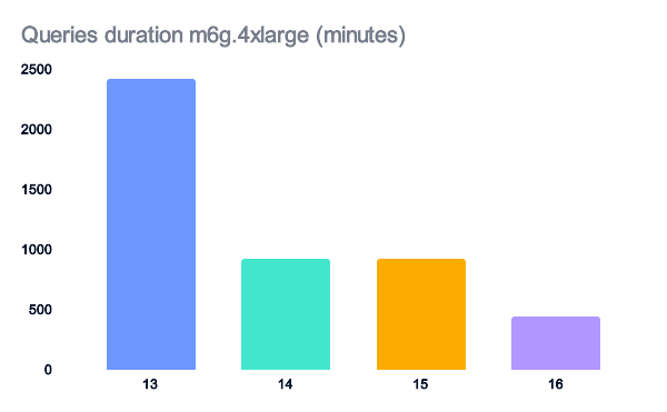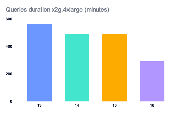 Having the test suite gave us a good opportunity to check our queries against the new versions to ensure there were no regressions. We tested query set 2 on db.m6g.4xlarge and db.x2g.4xlarge instances using PostgreSQL versions 13 through 16. To our surprise, we got a performance boost simply by using the newer versions.