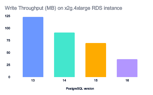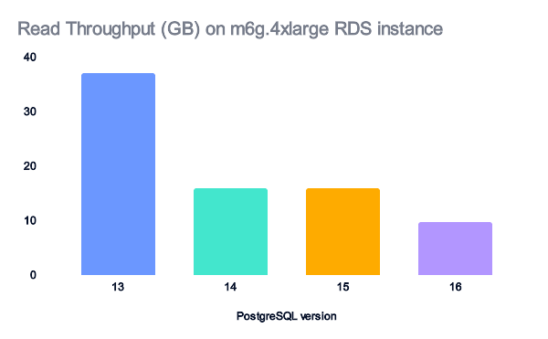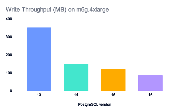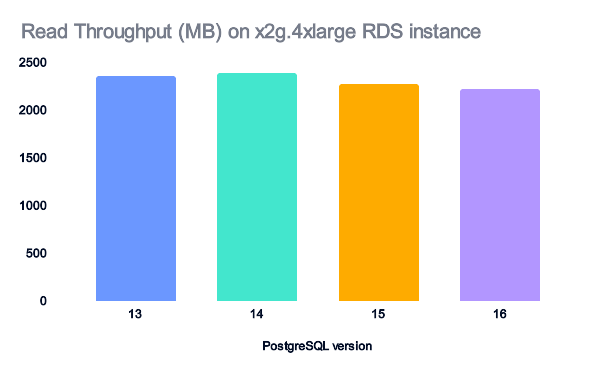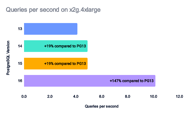 Similar performance gains were observed from PostgreSQL version 13 to 14. Then, a small additional gain was seen in PostgreSQL 16.
