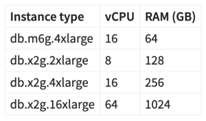 Our SaaS PostgreSQL instance is hosted on RDS. Version 13 was using a db.m6g.4xlarge instance with 16 vCPU and 64 GB of RAM. We were experiencing cache effects on multiple queries: the first run would take several seconds, while subsequent runs took only a few hundred milliseconds. We developed load testing for larger instances to better understand the impact on our workload. Here is a table of the instances we tested: