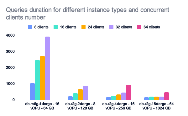 The test suite highlighted the effect of long-running queries. While 128GB of RAM might have sufficed, it would have halved our vCPU count. The benefit of doubling the CPU was noticeable under high load, so we opted to upgrade our instance to a db.x2g.4xlarge. This maintained the same number of vCPUs while quadrupling the RAM to 256 GB.
