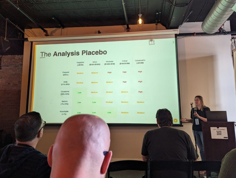 In her talk "Educating Your Guesses: How To Quantify Risk and Uncertainty," Sara Anstey, Director of Data Analytics and Risk at Novacoast, explained that most current models of cybersecurity risk are not properly taking into account range compression and are making decisions with not enough information. Essentially, if we have two threats, we are going to judge them against one another rather than stepping back and looking at the larger context. Sara urged us to embrace uncertainty and utilize Monte Carlo simulations to better estimate potential outcomes. By defining risk, setting time ranges, and assigning values with confidence intervals, she demonstrated how to produce more reliable risk assessments. Anstey's session reminded us that while we can't predict the future, we can improve our estimations and make more informed decisions. Run those simulations!