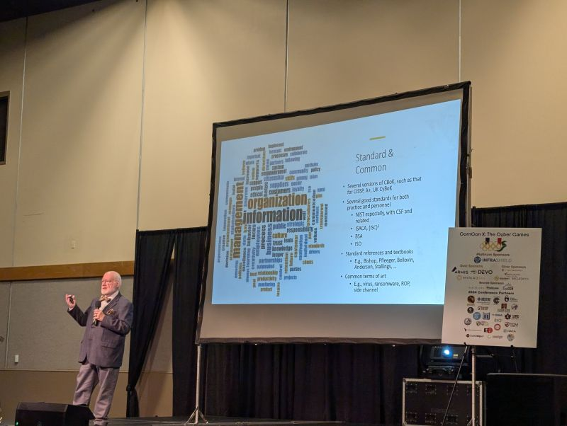 In a real highlight for participants, CornConX featured Dr. Gene Spafford, Author and Professor at Purdue University, presenting "Myths and Misconceptions in Cybersecurity," based on his book of a similar title. This thought-provoking session explored some core issues holding us back as an industry, including the fact that we use language wholly unique to us in security but expect the larger world to know what we mean. For example, the word 'virus' means something very different to a blue teamer than it does to someone working in microbiology or public health. The term "ransomware" is unique to our space and not understood by the average user.