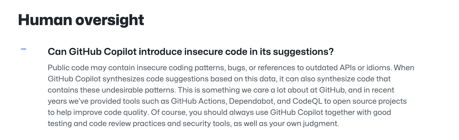 GitHub does acknowledge that Copilot can introduce security vulnerabilities and that it should be complemented with other security tools, specifically other GitHub tools of course.