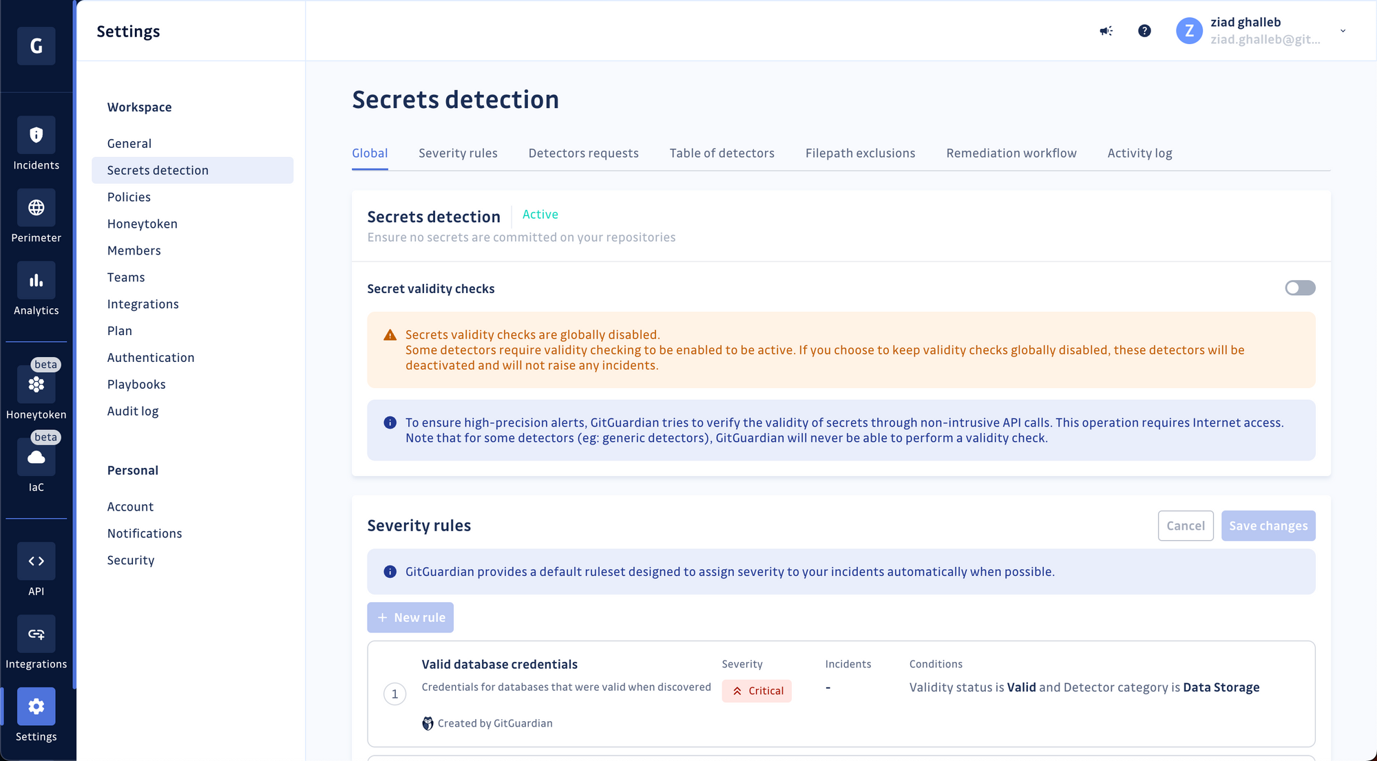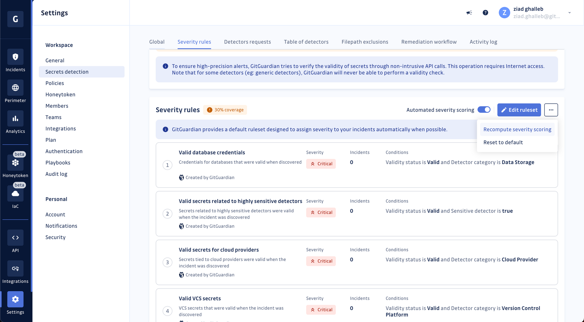 Sign in to your GitGuardian account, go to your workspace settings, and click "Secrets detection" in the menu—Toggle Automated Severity Scoring on.