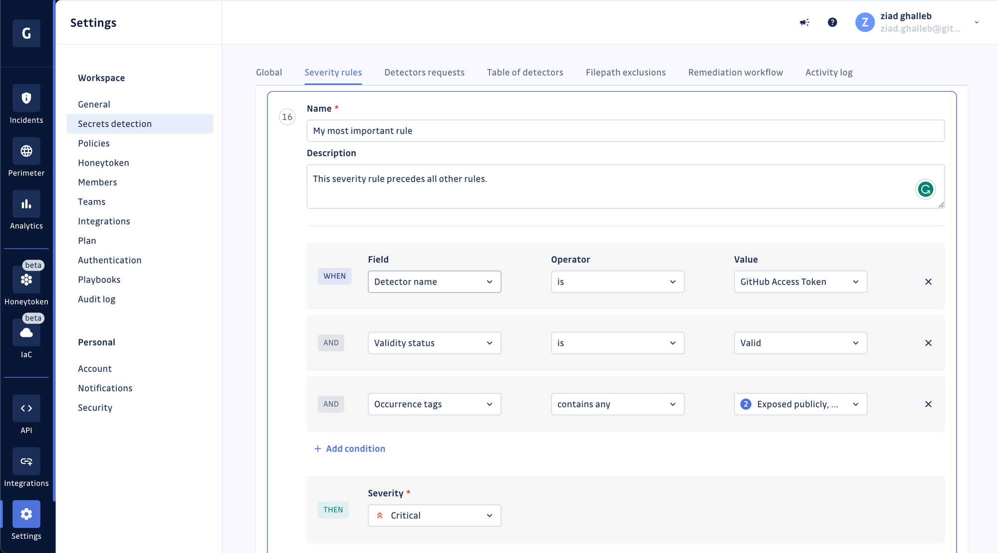 Choose a name for your rule and add a short description. Then proceed to define the conditions of your new rule. In this example, we're looking for occurrences of GitHub Personal Access Tokens that were found valid by GitGuardian's validity-checking mechanism and exposed in public repositories.