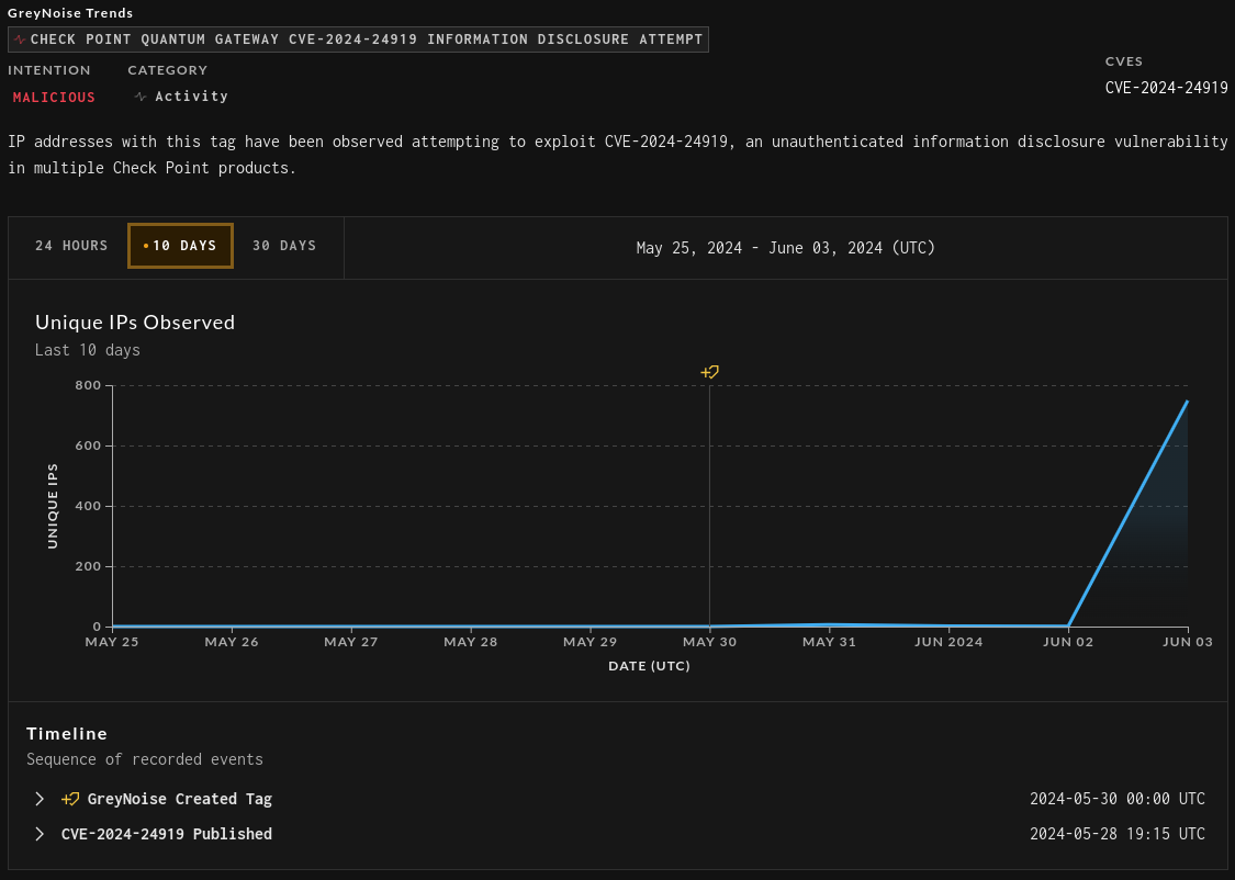 While this vulnerability was disclosed at my checkpoint on May 28th, it was being exploited as far back as April 7th nearly 2 months BEFORE any public notification of it. But since public notification, we have see a massive spike in exploitation in the wild as shown in this graph by Gey Noise