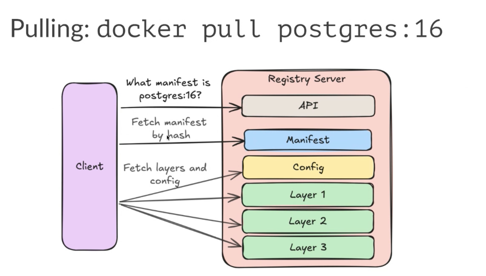 When you run docker pull postgres:16, Docker interacts with a registry server (e.g., Docker Hub) to fetch the manifest, then downloads each specified layer sequentially. Here's a succinct overview: