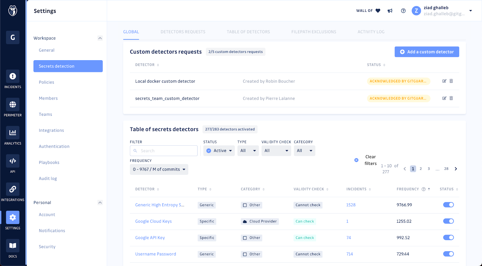 In GitGuardian, workspace administrators can configure the secrets detectors they want to see running and directly add custom pattern detection (for organization-specific secrets) from the UI.