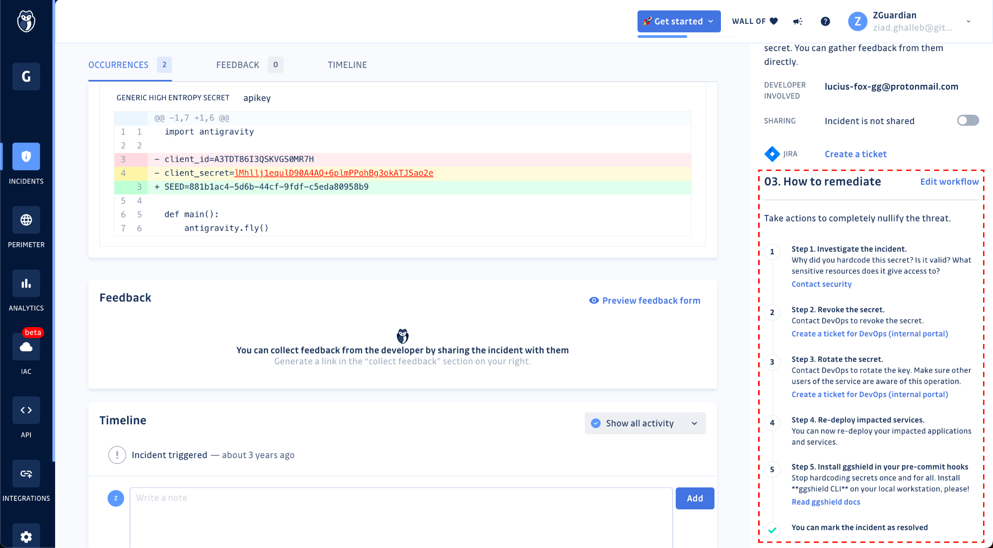 - Regression: the incident was once resolved, but GitGuardian detected a new occurrence.