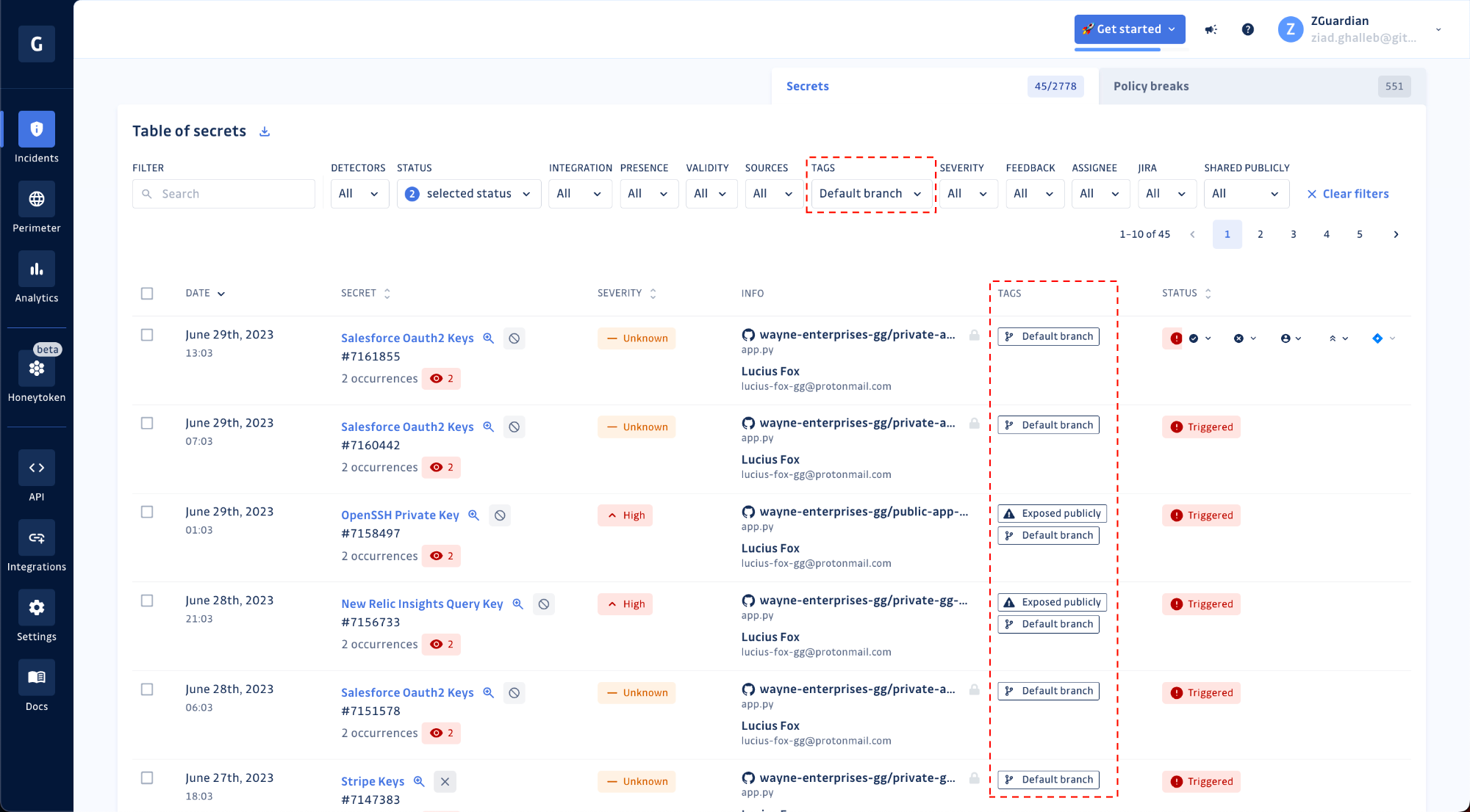 In July, we added a new tag for incidents where at least one occurrence of the secret was found in the default branch of a repository. Without a surprise, this tag’s value is “Default branch.” Look out for this tag because, in many cases, secrets found on a default branch are more sensitive than others, especially if this branch is used to trigger deployments to production environments.