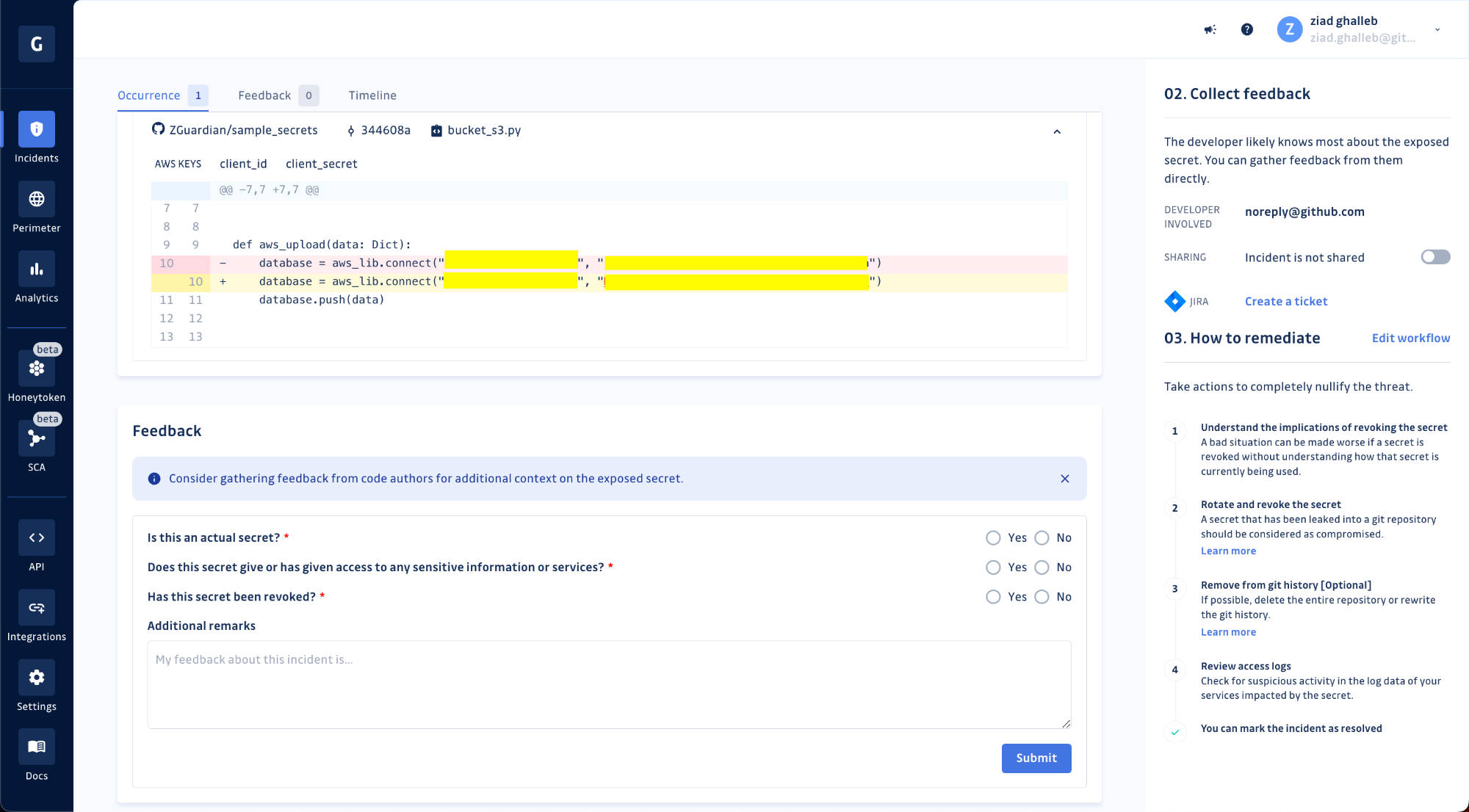 Engaging your developers during the remediation process can be difficult. Previously, we gave security teams the option to generate a sharing link (to an external page) and send it to the involved developer to submit their feedback. Now, developers with a GitGuardian account can access their incidents and directly submit their comments and observations in-app. We’re doing everything we can to shorten the feedback loop!