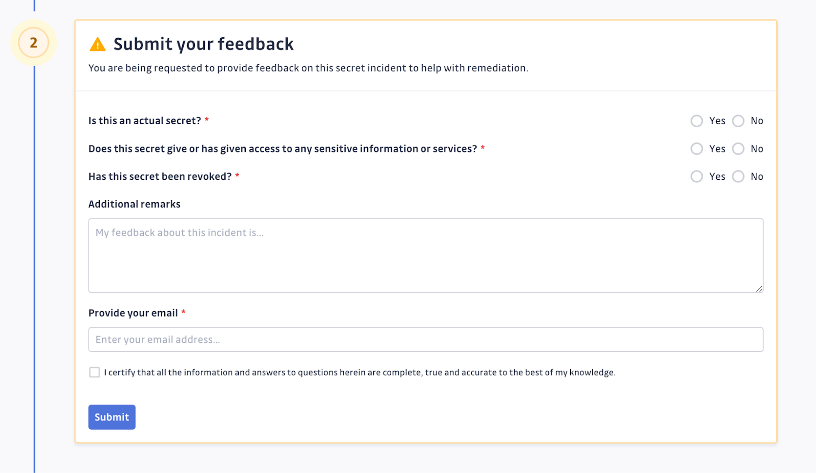 Security team members can generate a public link that is accessible to unregistered users and provides all the details of the incident along with a feedback form. The form asks the developer who made the commit if this is an actual secret, if the secret gives access to any sensitive information or services, and if the secret has been revoked. It also gives them a text box to provide any additional relevant information. When the link is no longer needed, it can easily be revoked.