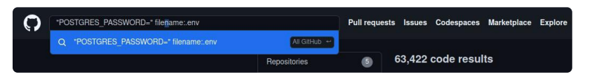 We did a GitHub search, scanning a number of repositories, and were alarmed to find more than 1000 results related to PostgreSQL credentials. Secrets found in public GitHub repositories are readily available to anyone on the internet. Yet, monitoring public repositories remains largely overlooked in today's external attack surface scanners.