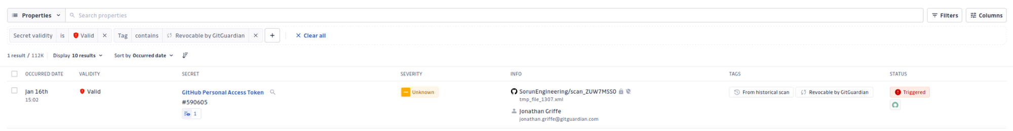Immediate Action: Security teams can now revoke valid secrets with a single click directly from the incident detail view, without leaving the GitGuardian platform. This instant revocation capability is designed to close the critical attack window.