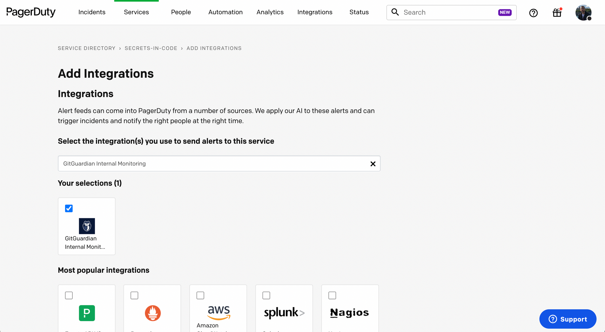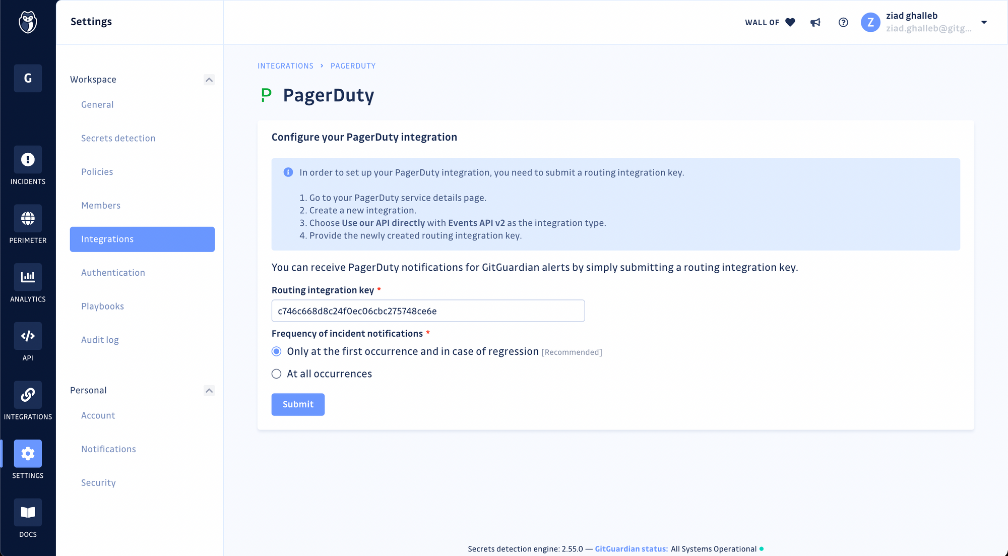 The integration can also be set up to wire events from GitGuardian to PagerDuty: