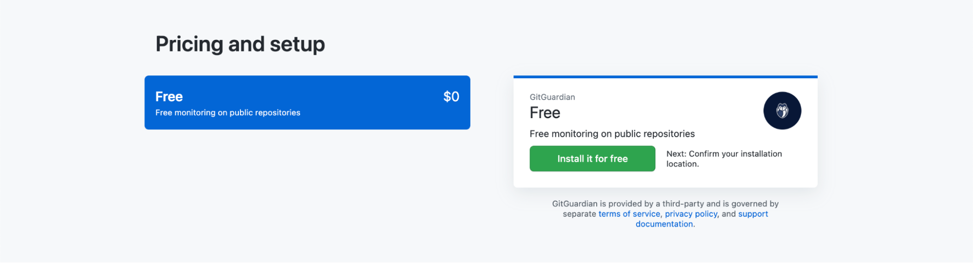 Click on Install it for free, GitHub will prompt you to confirm purchase through your existing GitHub account. When the process is complete, you will be asked to authorize GitGuardian to access your GitHub profile with OAuth. Finally, you will be directed to your GitGuardian account page, welcome on board!