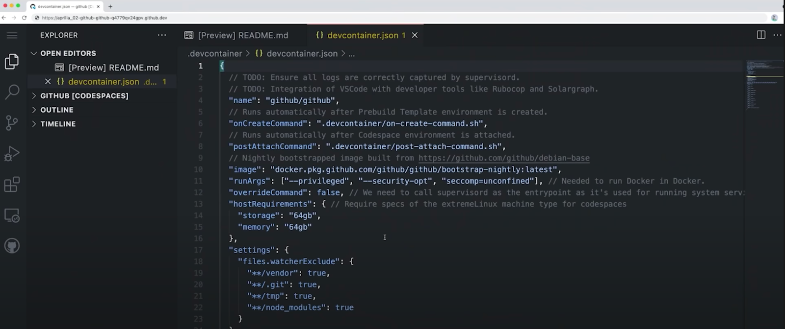 With CodeSpaces you can now create a preconfigured environment specific to your organization: everything is managed with a single the devcontainer.json file.