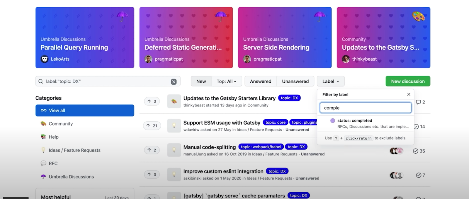 Maintainers can now keep their spaces organized with discussion labels, for instance, you can add labels for, topic, status and which release the decisions falls under.