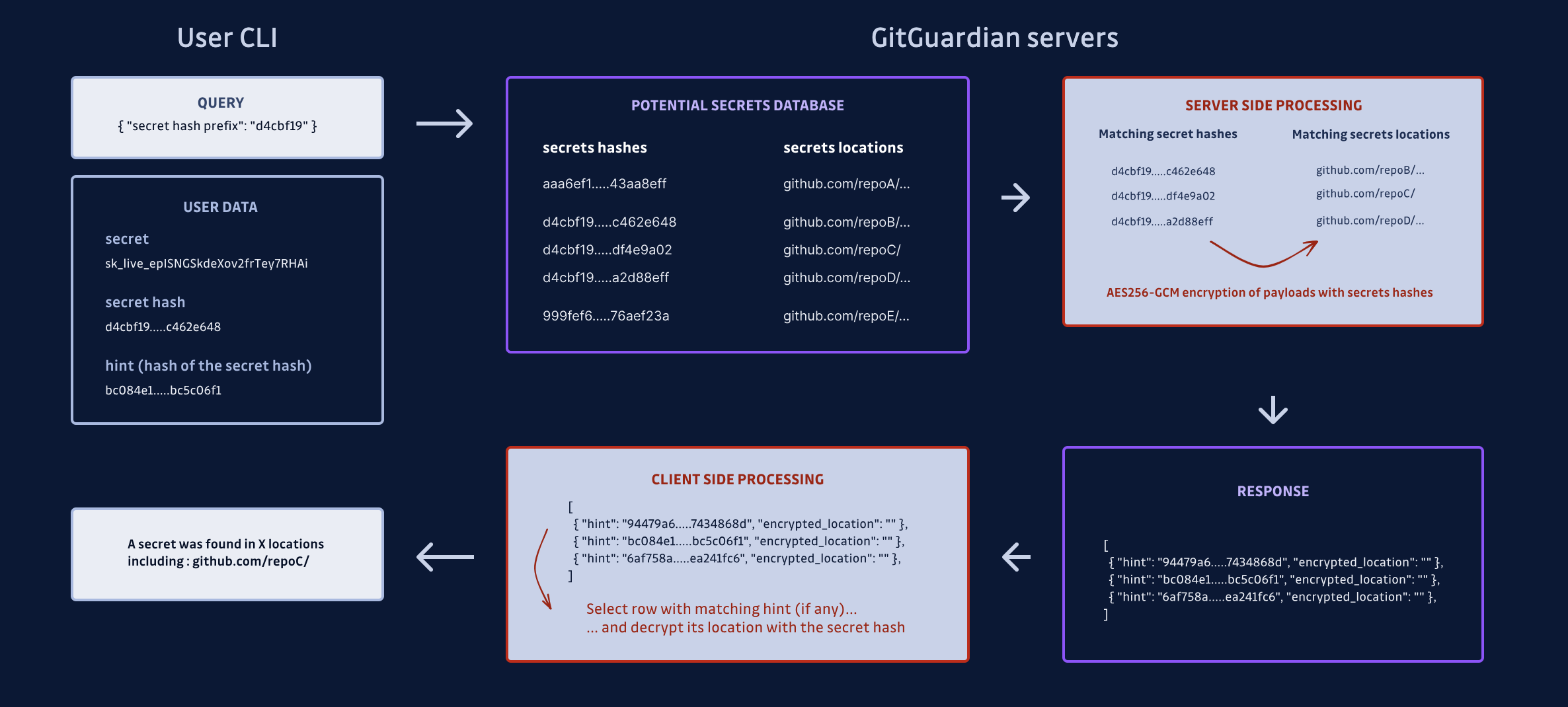 At GitGuardian, we believe in transparent, accessible and understandable security. This is why we aim to uphold complete transparency regarding the protocols behind HasMySecretLeaked. Our goal is to ensure the service remains resilient against malicious misuse while also fostering a trustless environment: with HasMySecretLeaked, you can rest assured that your secrets are secure - at no point do we have access to them, so you don’t even need to trust us!