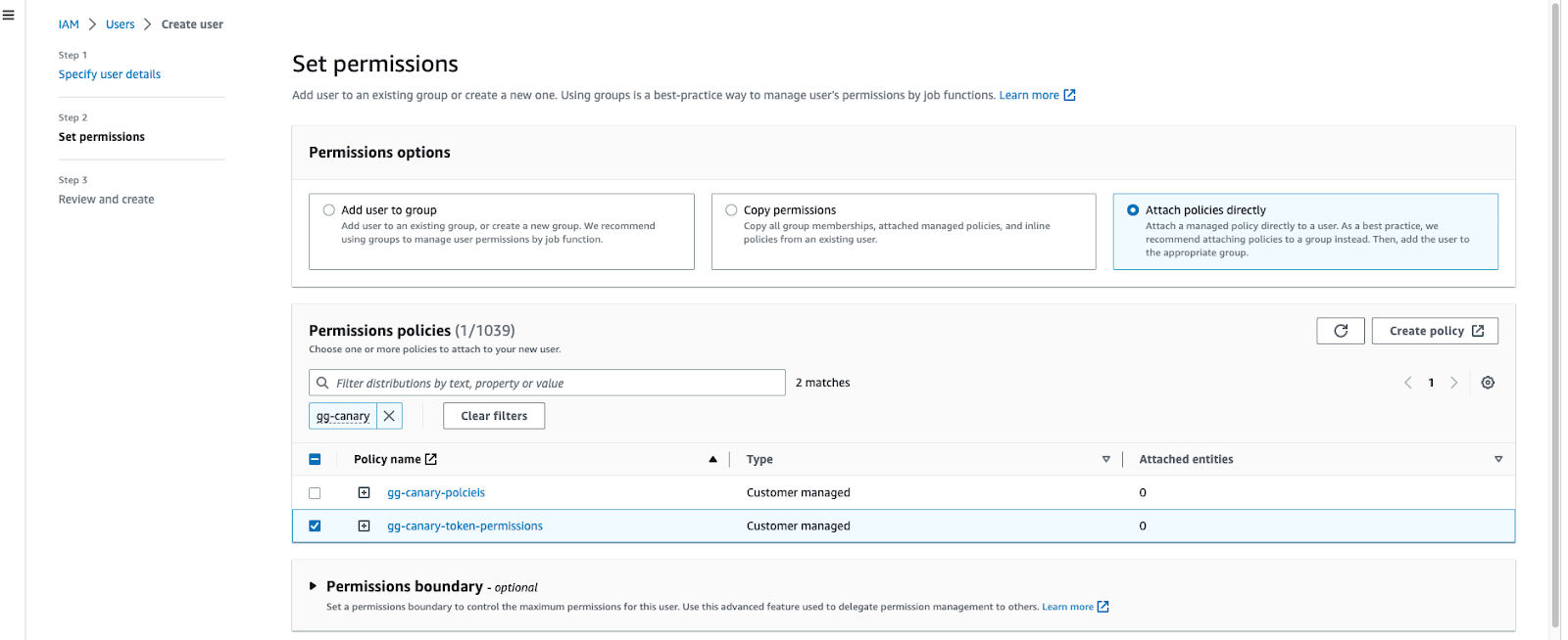 Permissions can be added to a group, this may be a good idea if you plan on creating multiple honeytoken users, or you can assign permissions directly to a user. For this tutorial, we will select "Assign policies directly" and click "Create policy".
