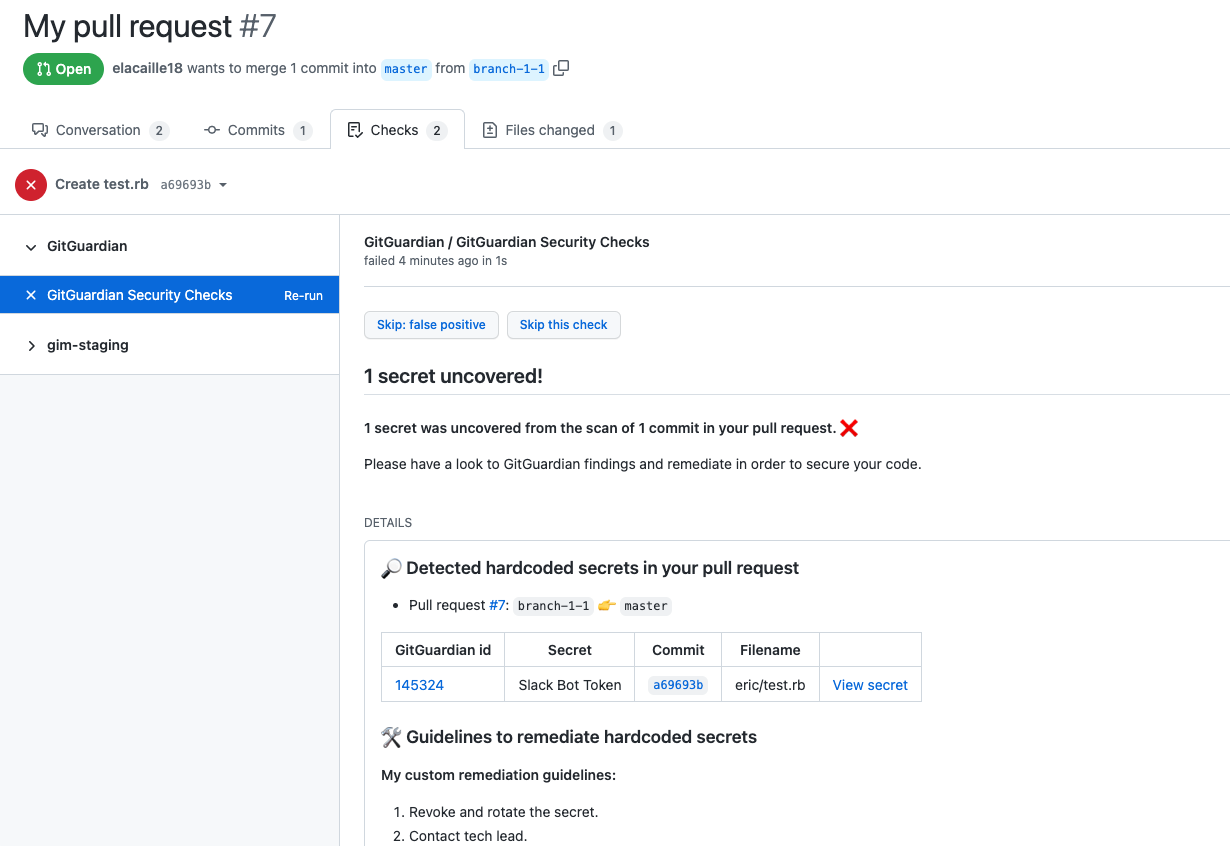 Lemontech implements secrets scanning at the pull request (PR) level. GitGuardian native integration keeps engineers focused and doesn't require them to leave the GitHub interface to manage incidents. Here is an example of a PR that failed to pass a security check: