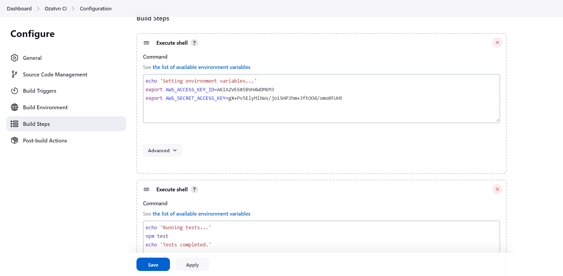 Jenkinsfilefound in your project repository. - Add the honeytoken into the script. It could be disguised as a decoy API key, a dummy password, or another type of attractive bait for an attacker.