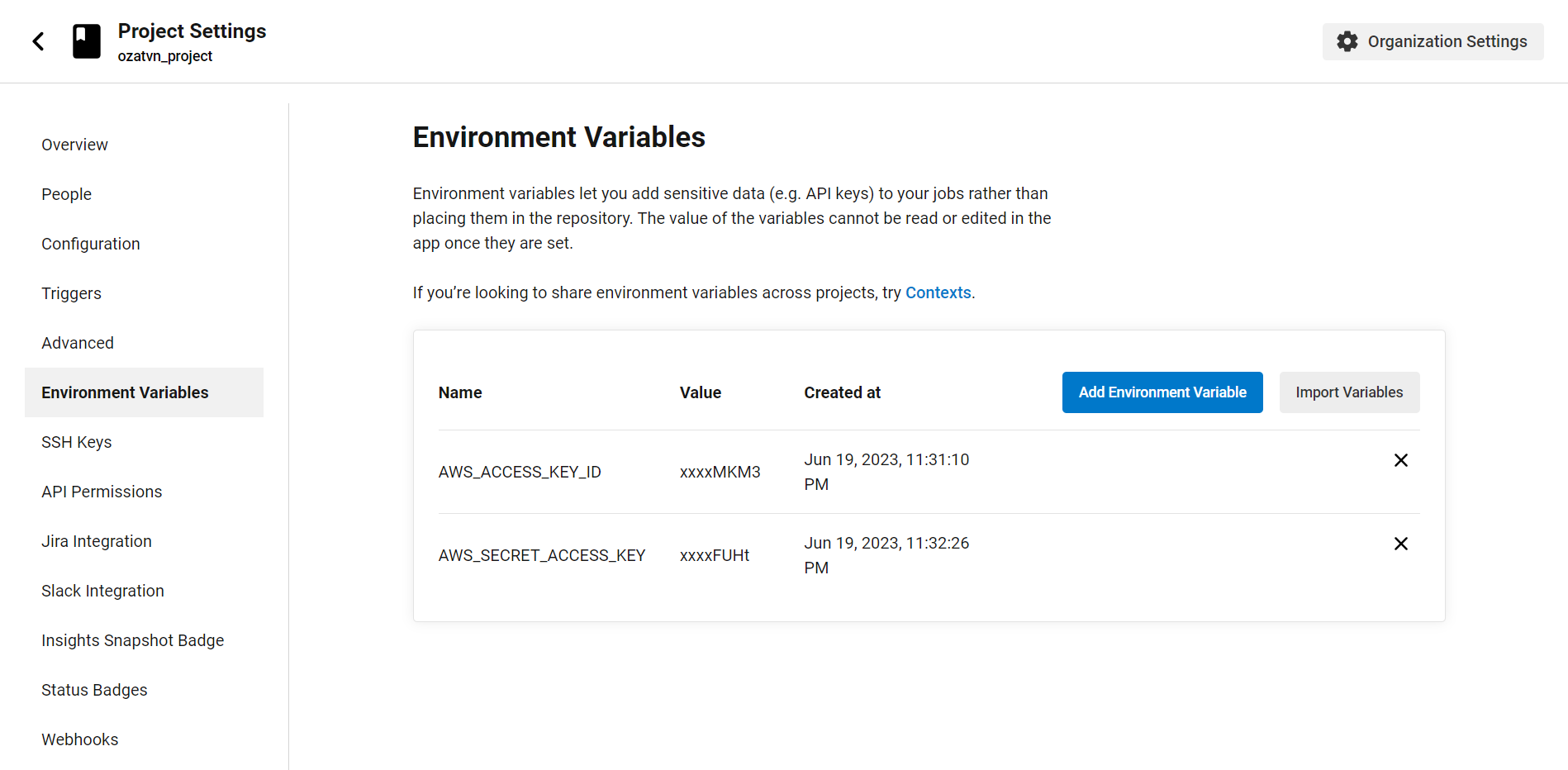 CircleCI uses environment variables as secure storage for secrets. Repeat the process to create a new honeytoken, then go to your project settings, find the "Environment Variables" section, and add your honeytoken there. If someone unauthorized gets ahold of these environment variables, your honeytoken will alert you right away.