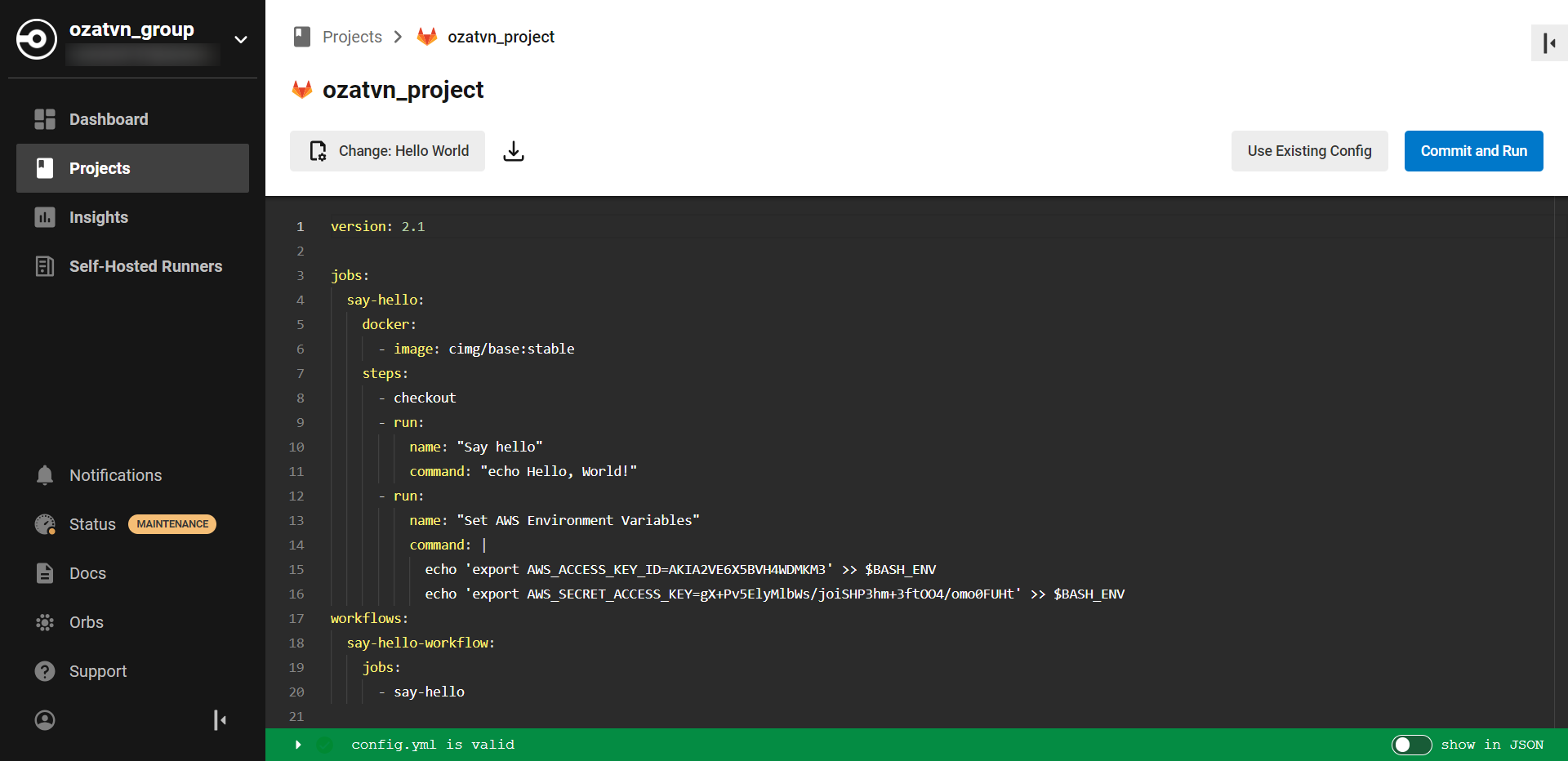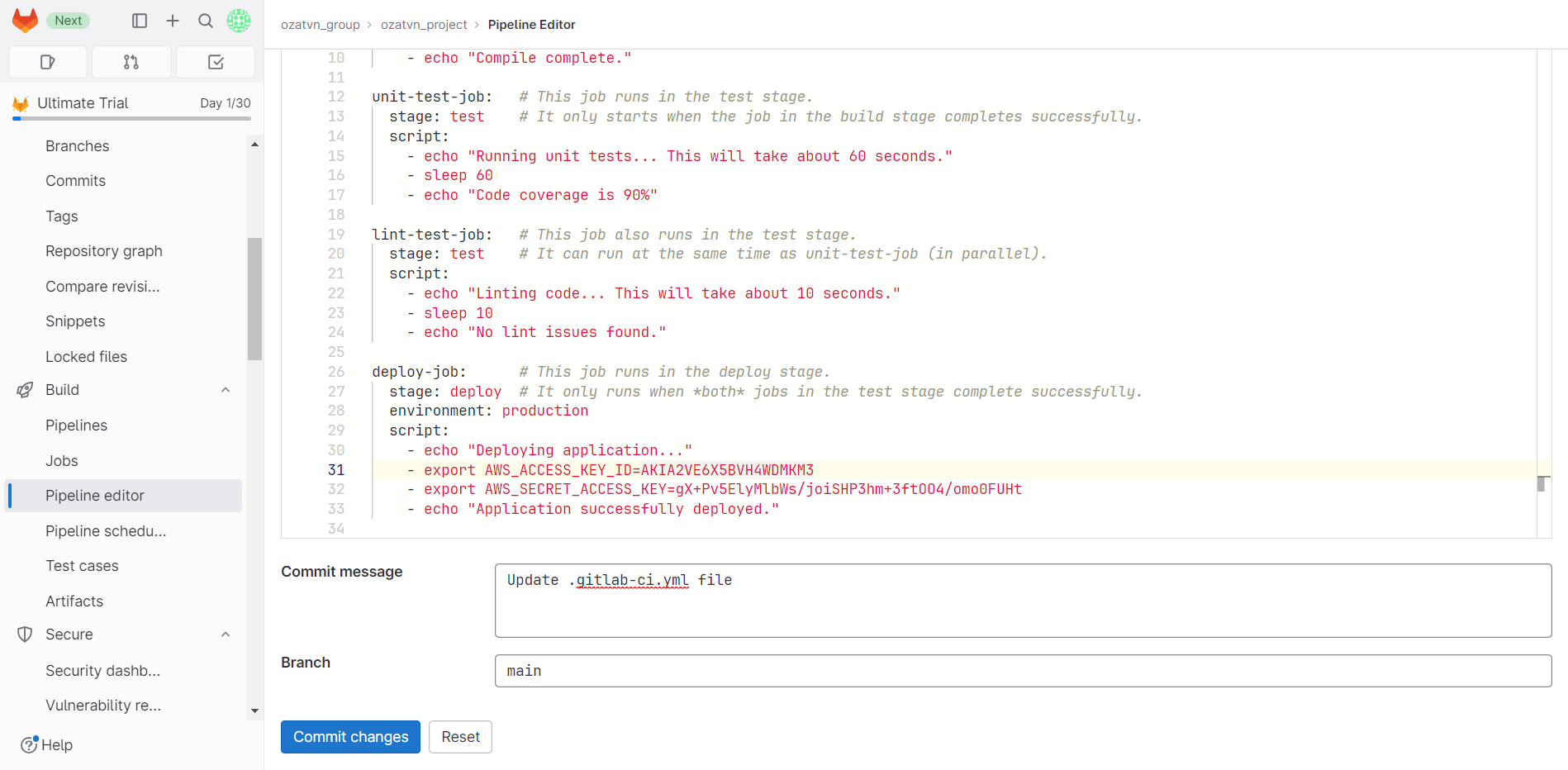 .gitlab-ci.ymlfile or any other configuration files within your project repository. - Place the honeytoken in the chosen location. It can masquerade as a decoy API key, a dummy password, or another tempting bait for an intruder.