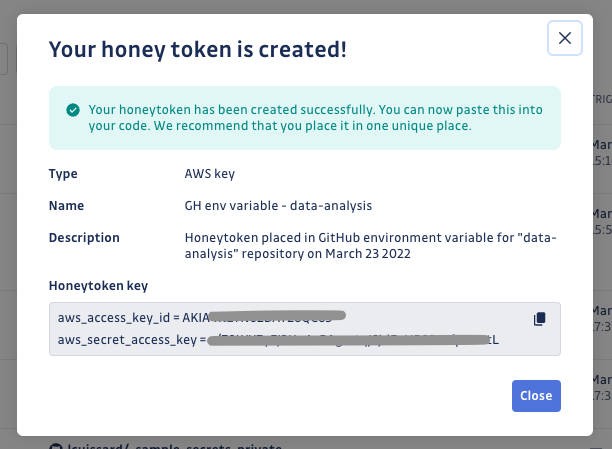 Congratulations! Your honeytoken creation has been confirmed, and you have received your honeytoken key.