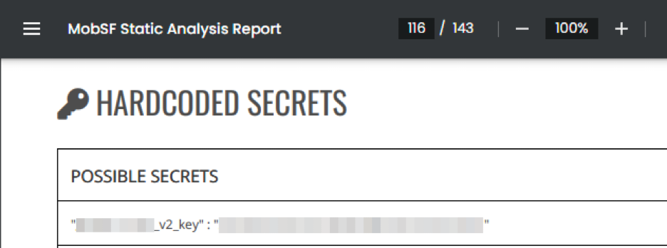There are multiple approaches you can take to reverse-engineer a mobile app and recover information inside of it. The simplest method is to perform static analysis using a mobile security tool like MobSF. Below is an example of a MobSF scan report, which includes checks for clear-text secrets.