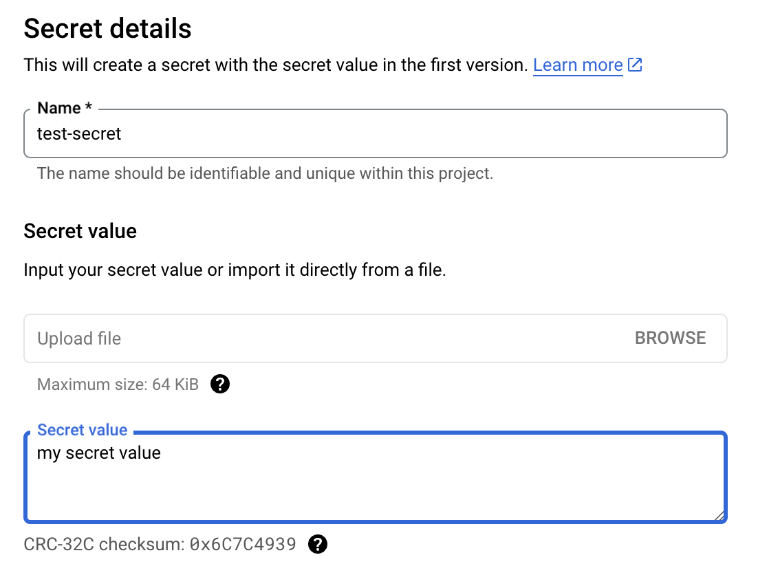 $ echo -n "my secret value" | gcloud secrets create test-secret2 \