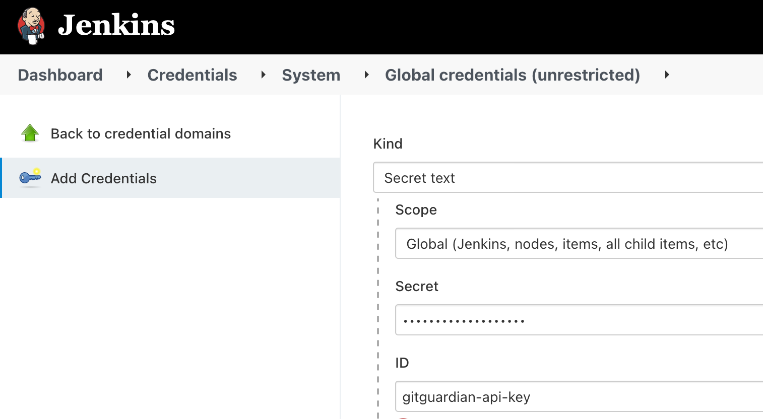 Similar to the above, do not forget to add your GitGuardian API Key to the gitguardian-api-key credential in your project settings.