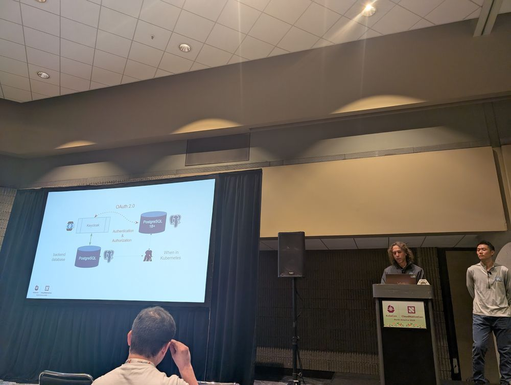 In the session “Modern PostgreSQL Authorization with Keycloak: Cloud Native Identity Meets Database Security,” Yoshiyuki Tabata, Senior OSS Consultant, and Gabriele Bartolini, VP of Chief Architect of Kubernetes at EDB, showed how they integrated the open‑source IAM solution Keycloak with a Kubernetes‑native PostgreSQL operator, called CloudNativePG. Database authentication and authorization are delegated to OAuth2 flows and tokens rather than static database passwords or LDAP alone.