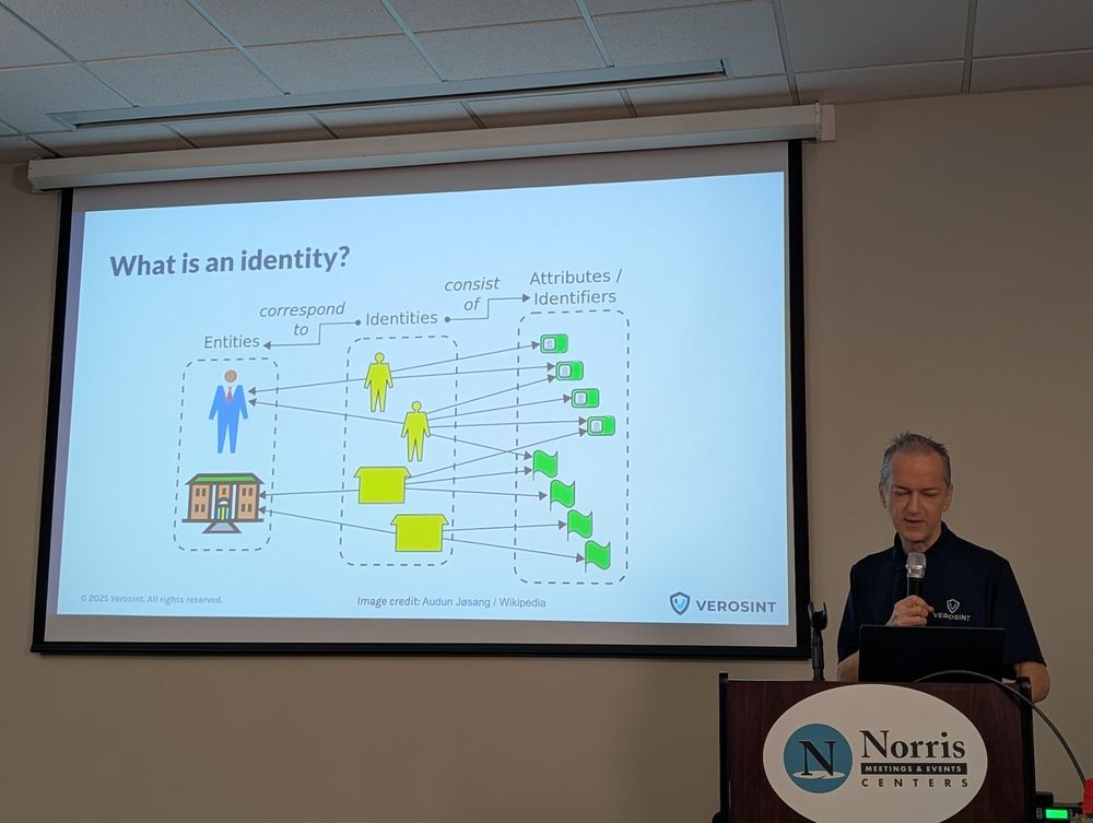 He walked through identity profiles that cover both human and non‑human actors, differences in behaviour by identity type, and contextual indicators such as geo‑location, time‑of‑day, device type, ISP/VPN usage, and browser fingerprinting. The attack surface has shifted and adversaries are far more likely to log in than to breach a network via old playbooks. Challenges include the scale of automated traffic, antique operating systems still in use, and look‑alike domains (e.g., Outlokk[.]com).