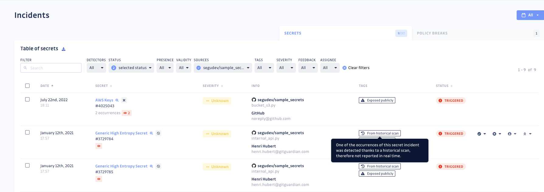 Click the source to display the Table of secrets. Incidents detected during a historical scan are tagged.