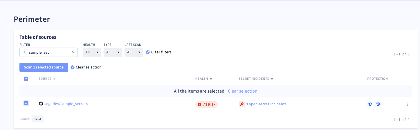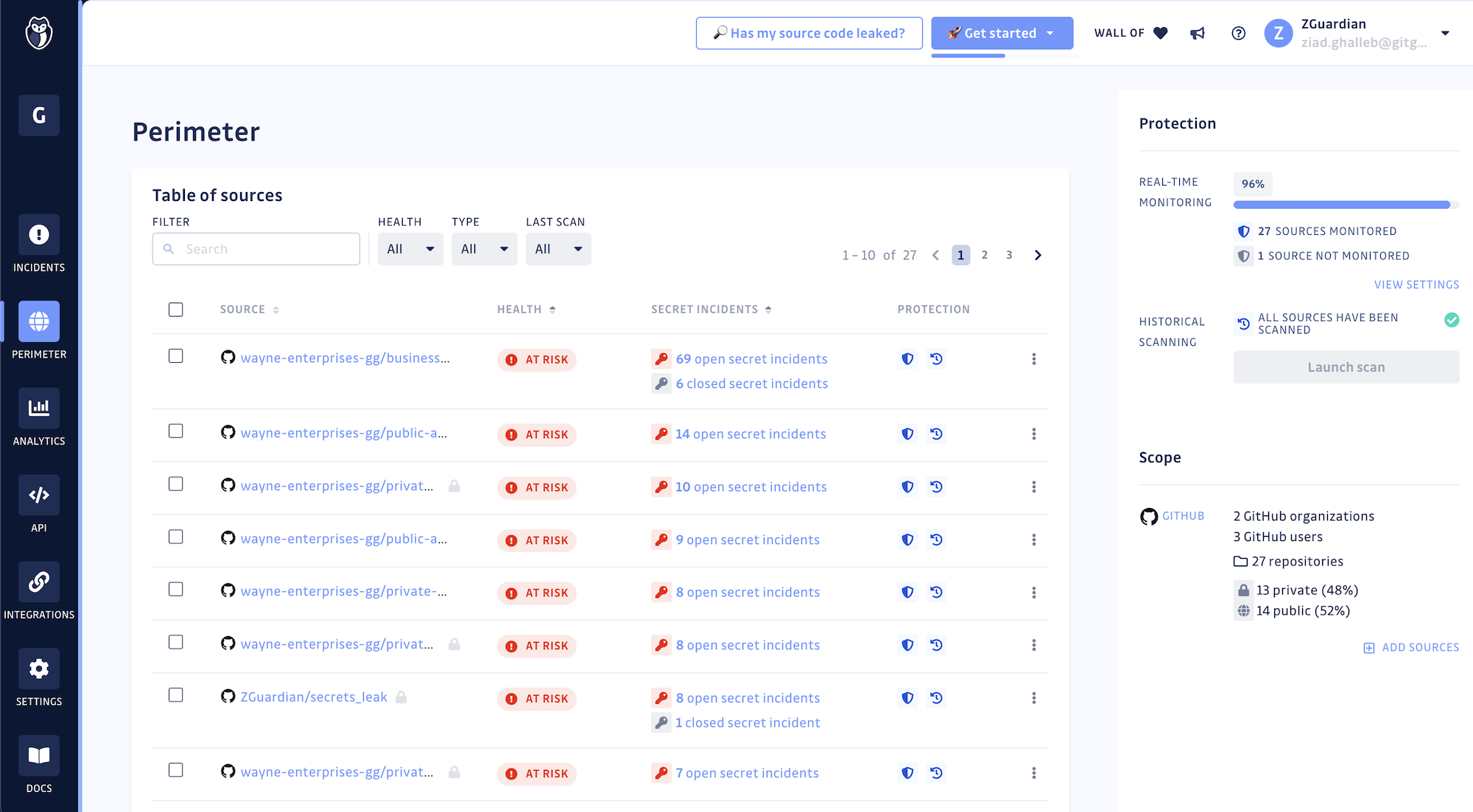 Go to your GitGuardian dashboard and search for the sample_secrets source on the Perimeter page. You should see that GitGuardian detected nine open secret incidents in the repository.