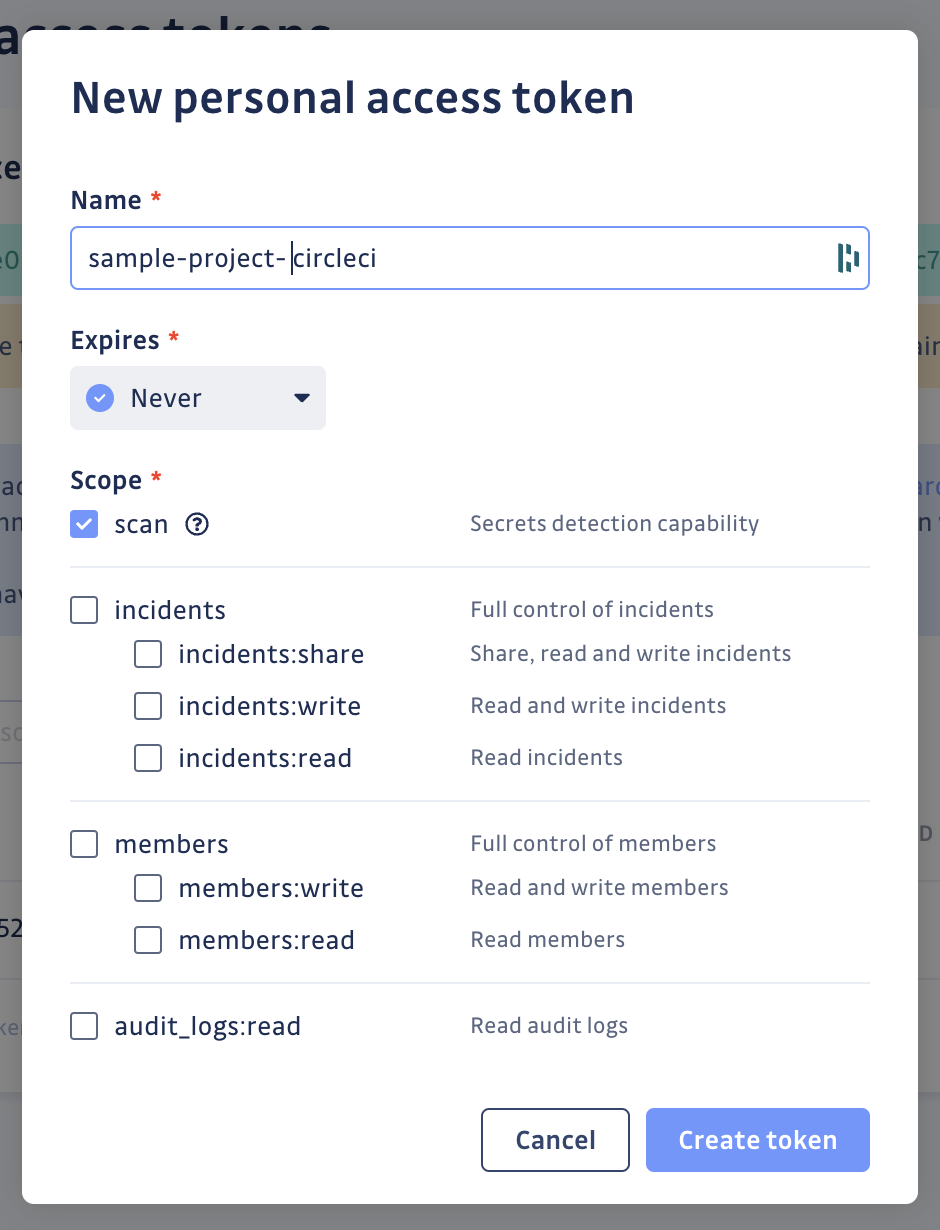 You need a GitGuardian API token to use the GitGuardian orb. From the GitGuardian dashboard, go to API > Personal access tokens and then click Create Token. Give the token a scan scope and a memorable name: