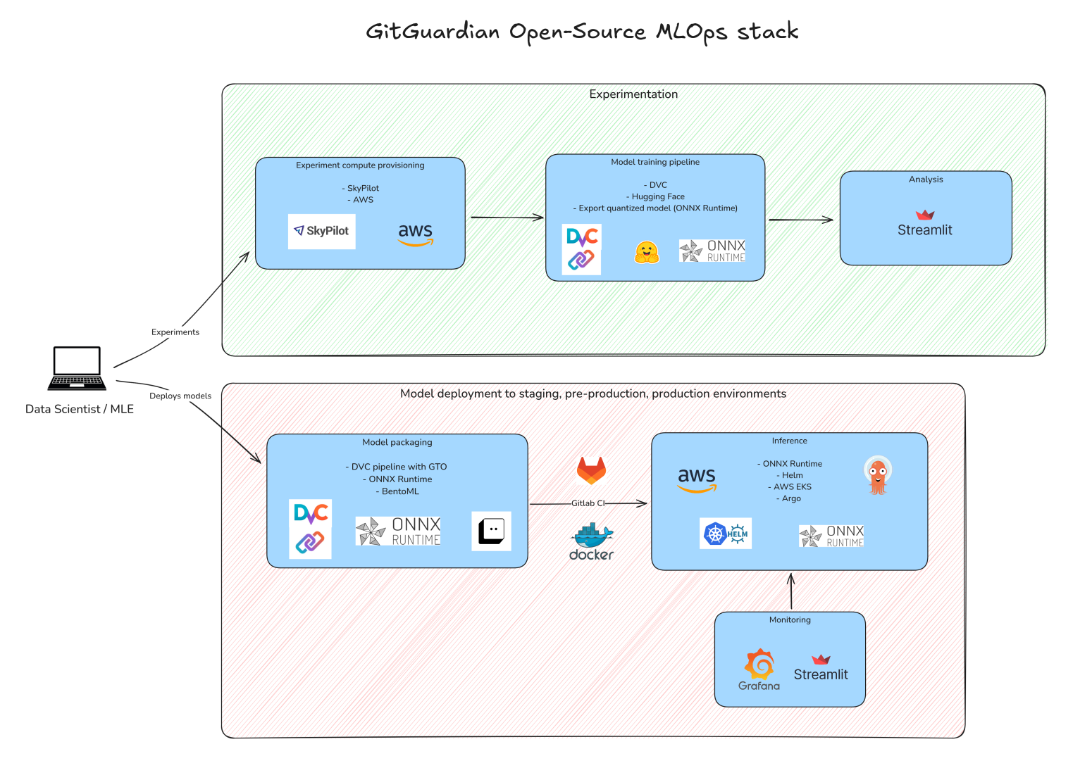 At GitGuardian, we leverage state-of-the-art NLP techniques to solve critical cybersecurity challenges. Our primary focus has been on reducing false positives in our Secrets Detection Engine and using contextual analysis to identify services associated with leaked secrets. To support these tasks from experimentation to launch, we’ve put together a complete MLOps stack powered by open-source technologies.