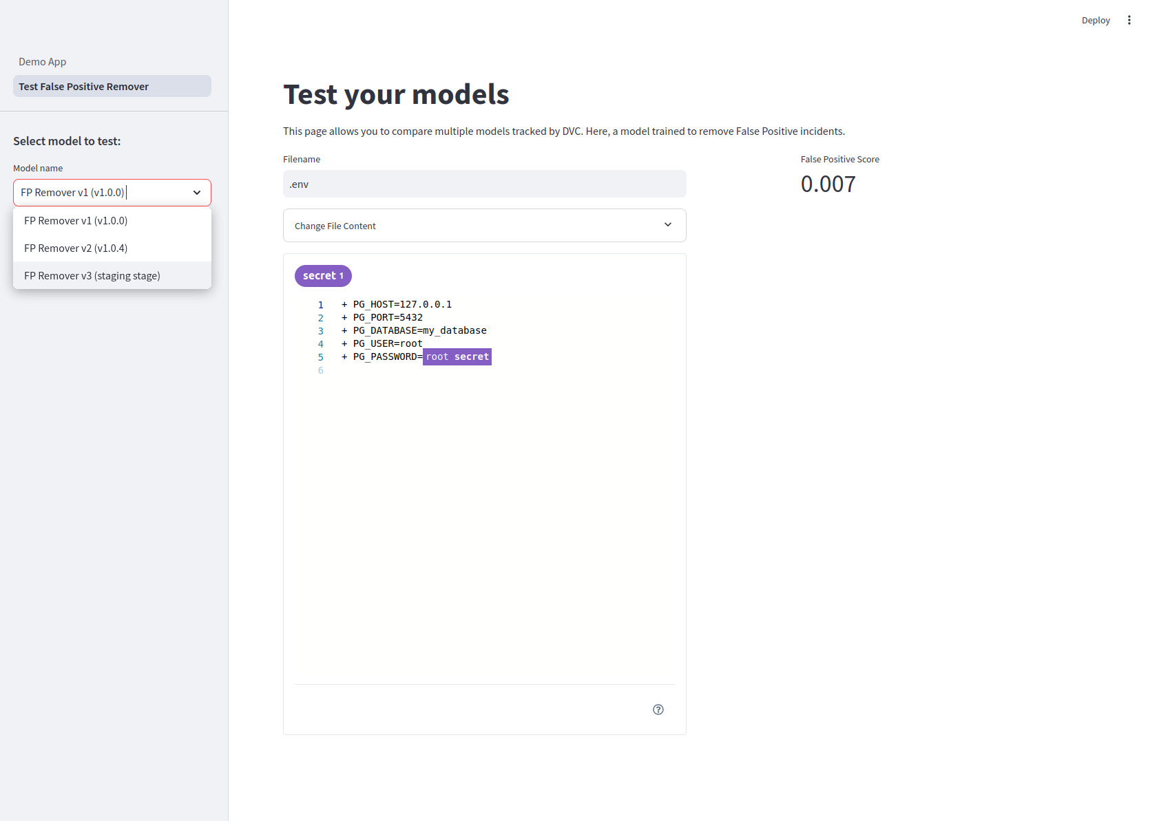 Thanks to DVC, retrieving previous versions of our model and getting prediction scores (in this case, the False Positive Score) on custom inputs ( the .env file content) became straightforward. Streamlit is the ideal tool to tinker with models and display such predictions.
