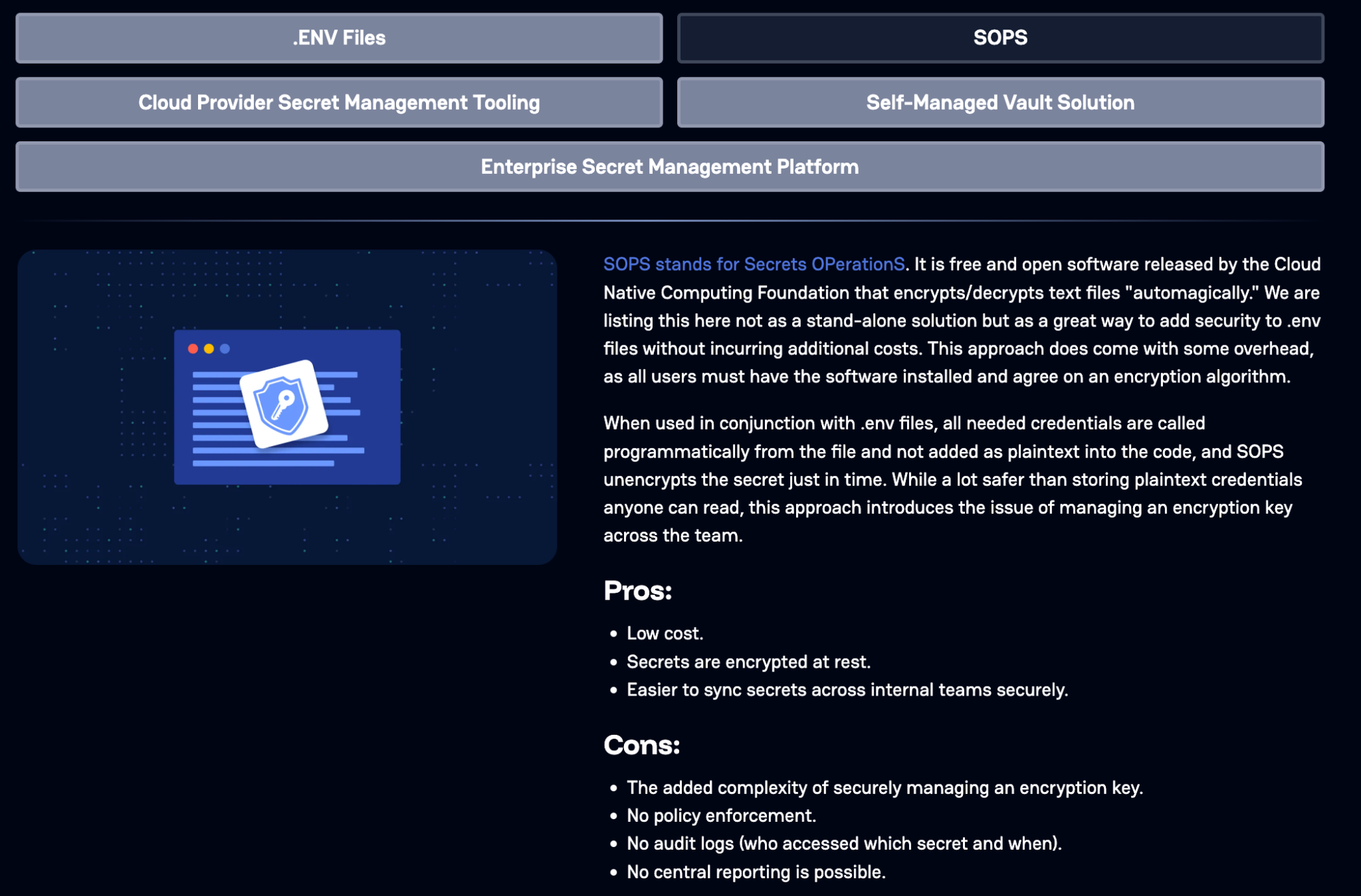 First, when a team truly needs to keep environment values in a file for repeatable local setup, use SOPS so the file is encrypted at rest and can be safely stored and shared without being usable by an attacker. The developer experience stays familiar, but the risk profile changes because secrets are no longer sitting in plaintext.