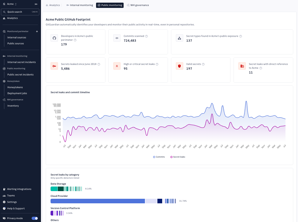Q2 also marked a major milestone for our platform: the integration of Public Monitoring directly into the GitGuardian platform. This means you can now scan public GitHub repositories for exposed secrets tied to your organization, all from the same unified interface.