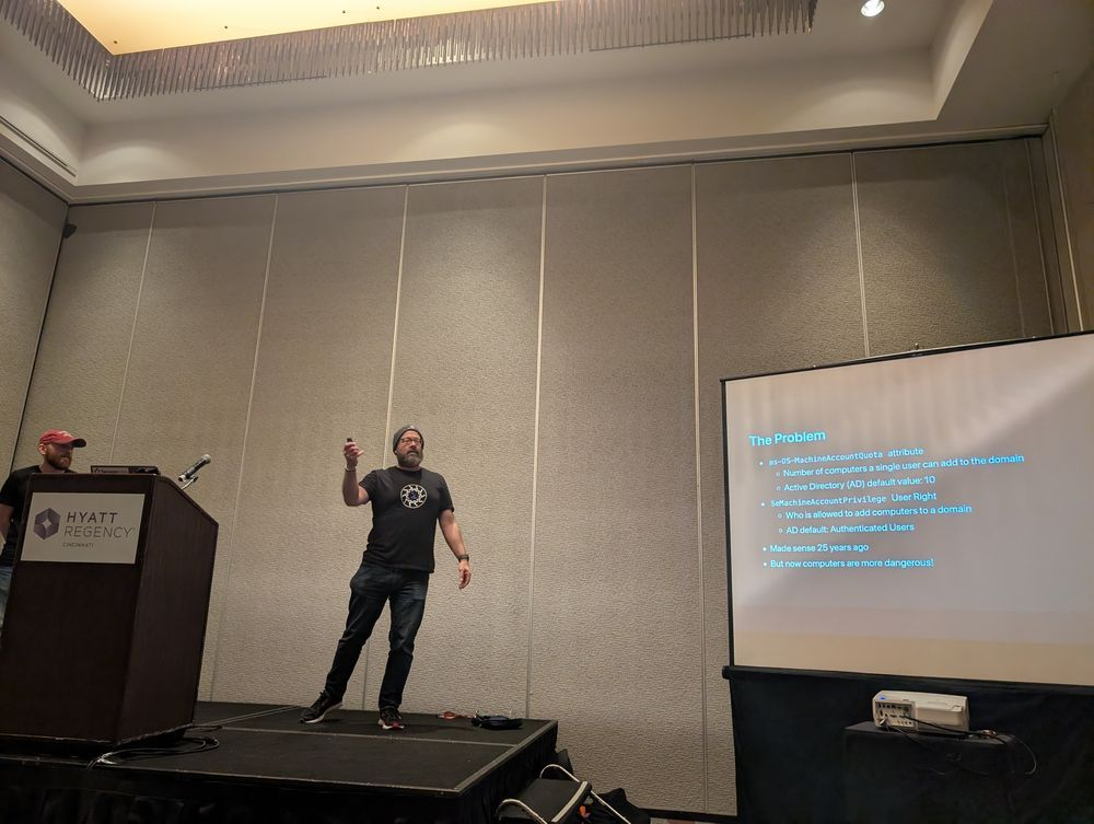 In their session “Making $ With COMPUTER$,” our , Principal Security Consultant at Semperis, and John Askew, Hacker and Founder of Terrapin Labs, showed how a plain user can join a machine to Active Directory (AD) and pivot to compromise the whole forest in minutes. Two default settings were at the heart of this issue. First, the ms-DS-MachineAccountQuota attribute lets certain users add up to 10 computers to the domain. The other is `SeMachineAccountPrivilege` user right, which lets any Authenticated User add those computers.