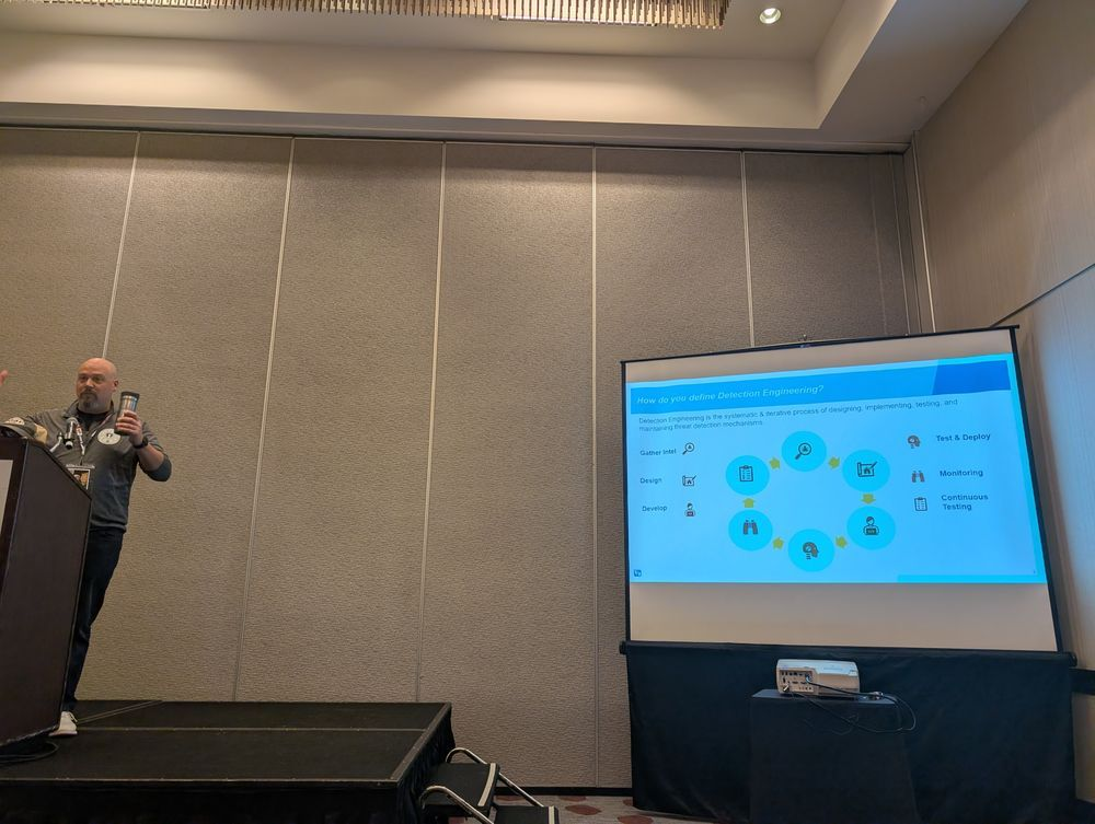 Trent Liffick, Principal Cyber Threat Analyst at Fifth Third Bank, in his session “Detection by Design: Engineering Resilience Against Evolving Threats,” argued that most teams believe they are designing for detection, yet many lack dedicated practitioners. He framed detection engineering as a lifecycle: gather intel, design, develop, test and deploy, monitor, and keep testing. The goal is coverage that balances integrity, operational cost, risk, and utility.