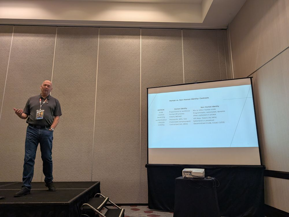 In his session "Non-Human Identity Management (NHI Management)," Scott Smith, Principal Consultant at New Era Technology, talked about how risk has shifted from people to non-human identities (NHIs). He defined this to include tokens, API and OAuth keys, certificates, bots, and service accounts, spread across our systems, code, and environments. Creation is automated, but ownership is unclear, and visibility is decentralized. Attackers know this. The common breach path is simple: a developer hardcodes a key, commits to a public GitHub repo, and automated scanners find it within minutes. Scott said that over half of organizations report breaches tied to machine identities, and that now 77% of web app attacks start with stolen credentials.