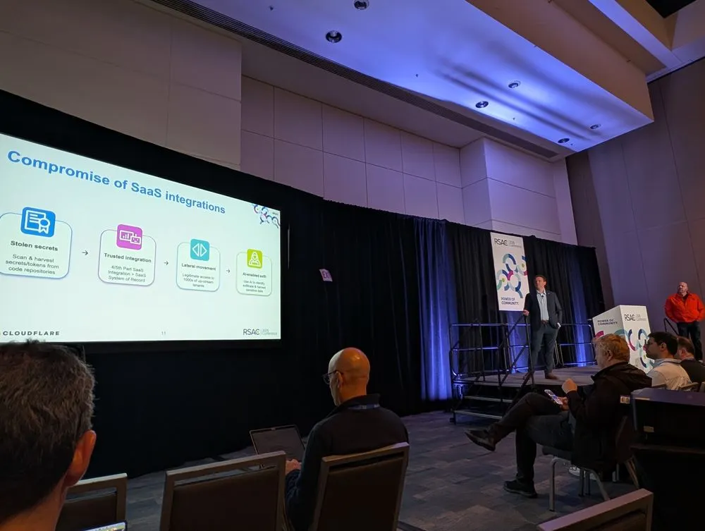 In the joint session from Grant Bourzikas, Chief Security Officer at Cloudflare, and Blake Darchè, Head of Cloudforce One and Threat Intelligence, called "The Internet's Crystal Ball: Threat Intel from the Largest Global Network," they presented the three largest and most pressing threats they are seeing from their unique vantage point. The individual pieces were familiar enough on their own: compromised SaaS integrations, stolen secrets, lateral movement, rising DDoS volume, insider exploitation, and AI-assisted operations. The attack surface is becoming more dependent on trusted paths, and those paths are often the least visible because they were built for convenience and scale.